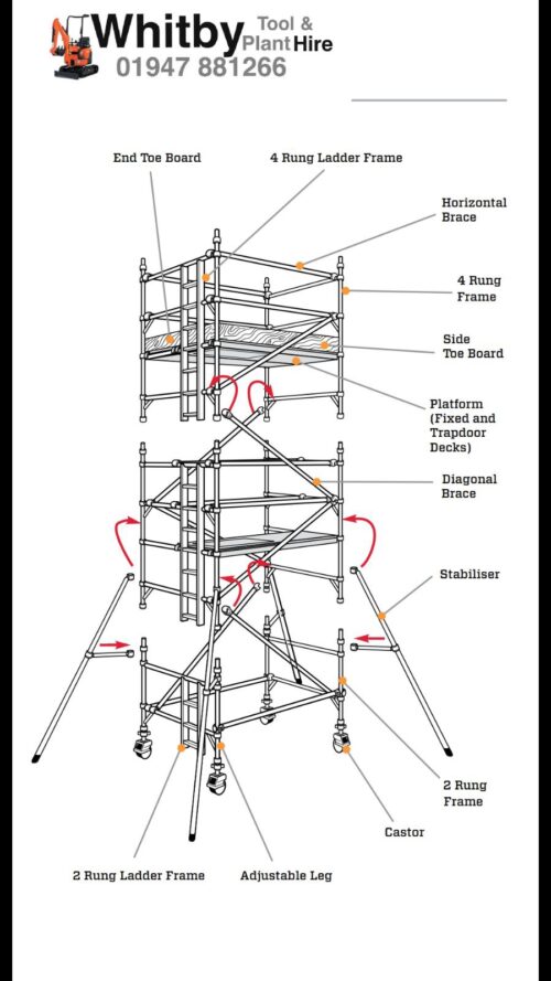 Single width mobile tower scaffolds 850 x 1800mm, available to hire ranging from platform height 1200mm (working height 3.2m) to 8200mm platform height ( working height 10.2m)